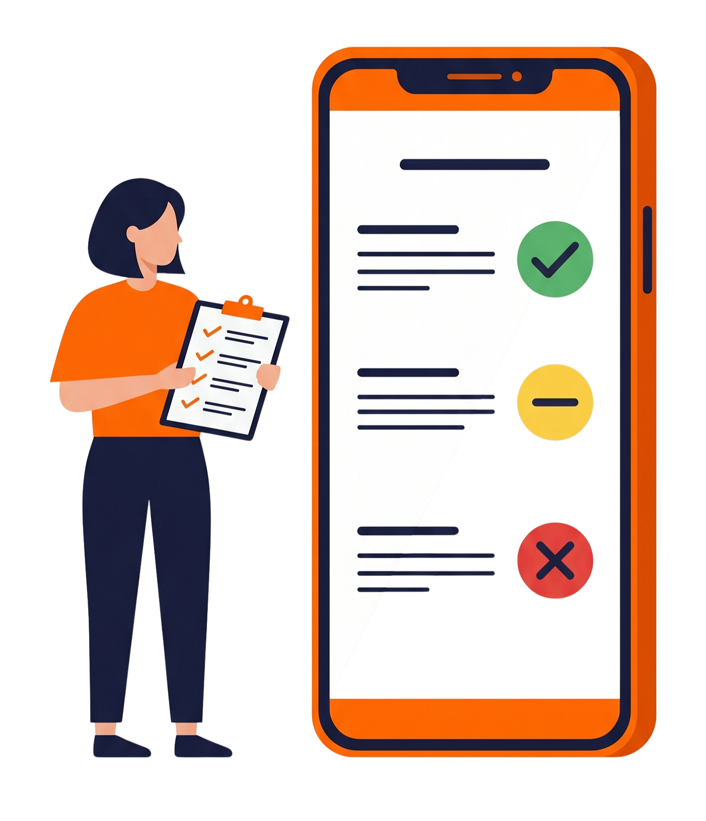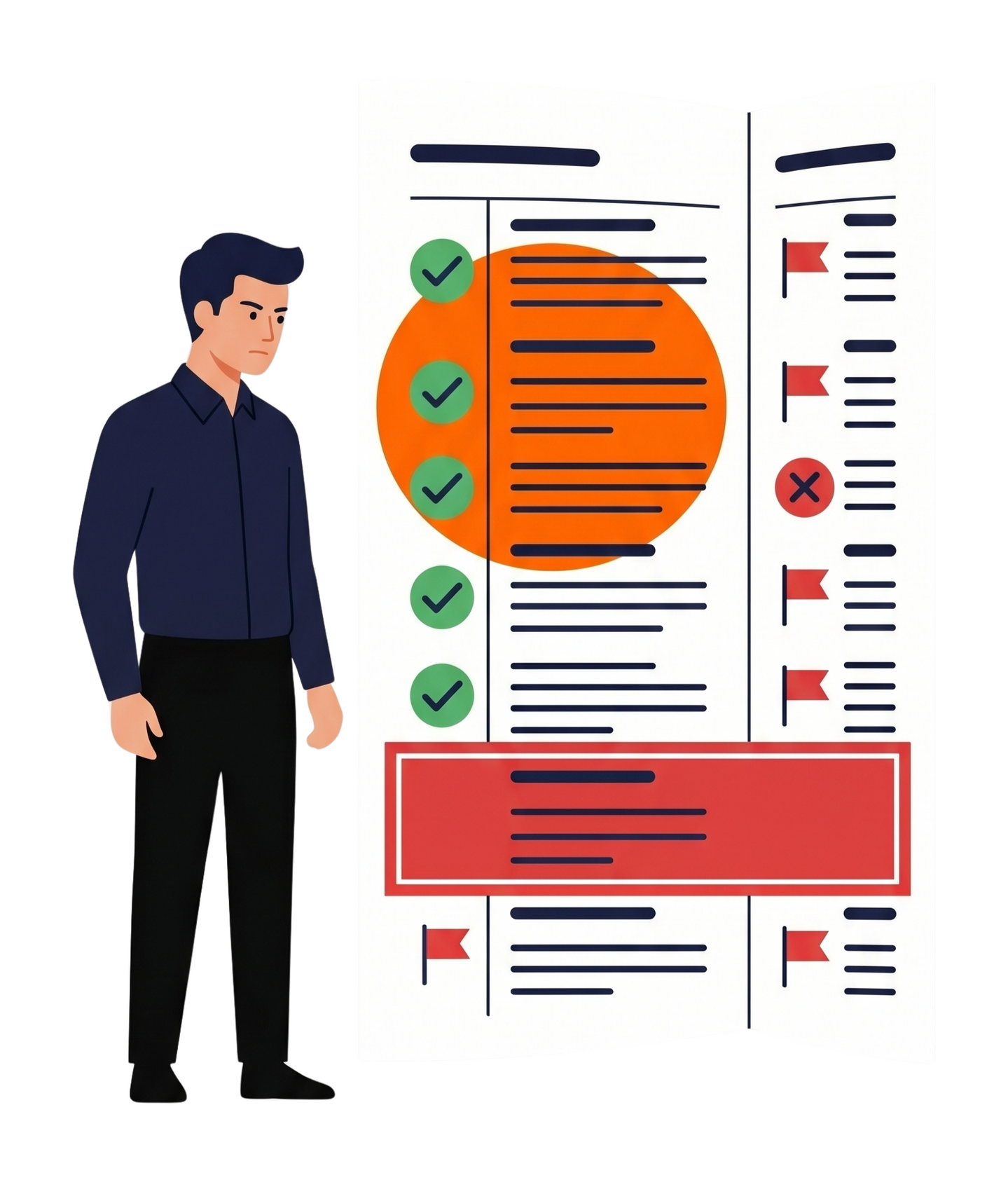 The traffic light system shows you precisely where action is needed. Each red or yellow item comes with a clear explanation of what's at stake and what to do next — no legal jargon, no guesswork.